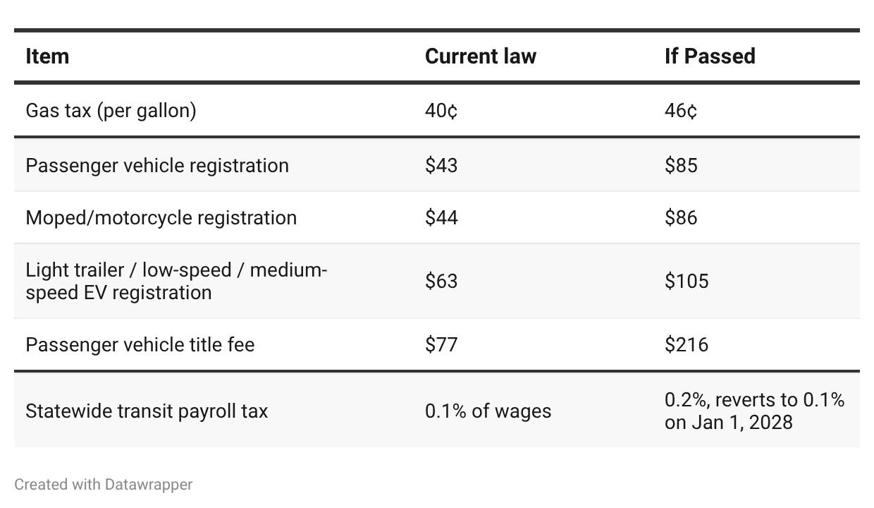 It’s a measure that increases fuel taxes, registration/title fees for roads, and a tax on wages for public transportation services.